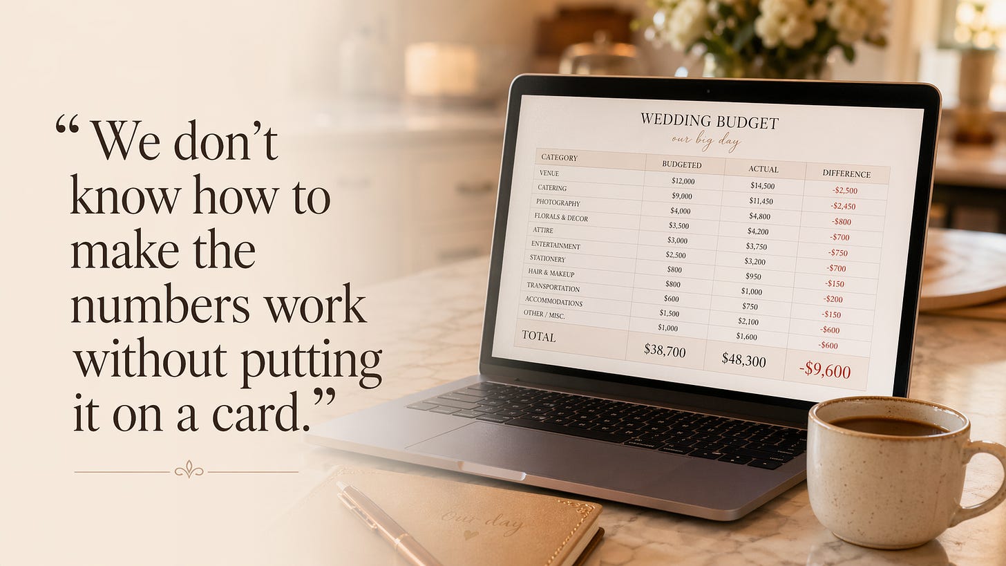 “We looked at venues last weekend. The one we both loved is $8,500 just for the space. That’s before food, before the photographer, before anything else. We’ve been saving but not for this. We don’t know how to make the numbers work without putting it on a card.”