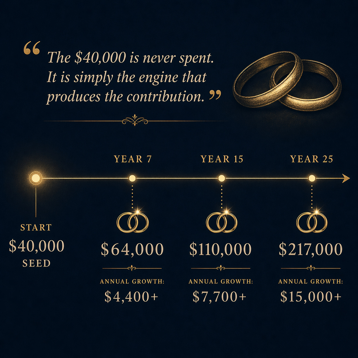 The $40,000 is never spent. It is simply the engine that produces the contribution, generation after generation, for as long as the family exists.