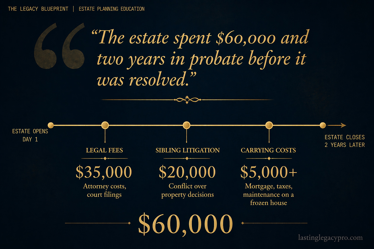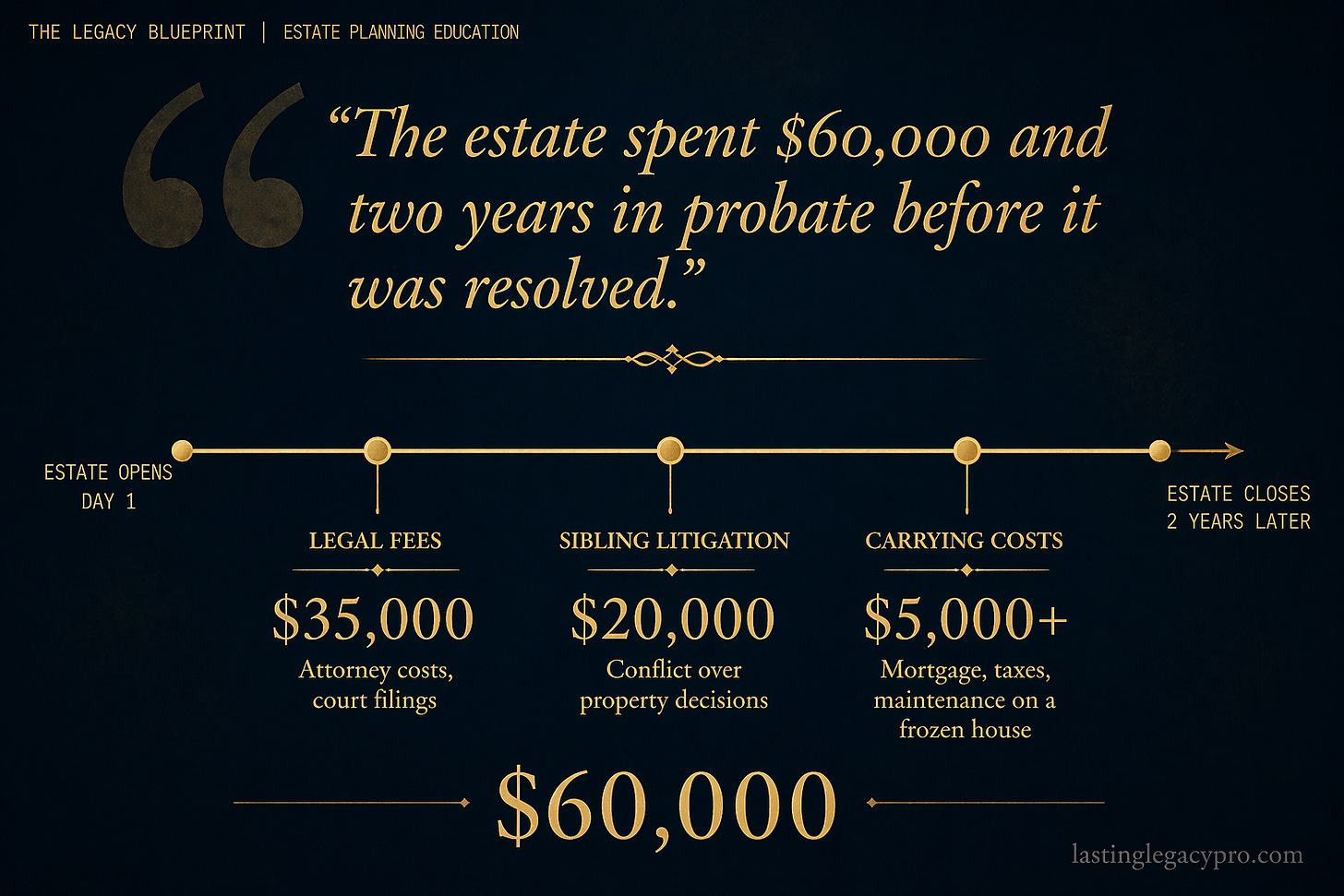 What happened to Mike and Lisa’s children is worth understanding in concrete terms. The estate spent $60,000 and two years in probate before it was resolved. The breakdown: $35,000 in legal fees, $20,000 in litigation driven by sibling disagreement, and more than $5,000 in mortgage payments, taxes, and maintenance costs on a house that sat frozen while the court process moved at its own pace. The house deteriorated during that period. The family fractured permanently.